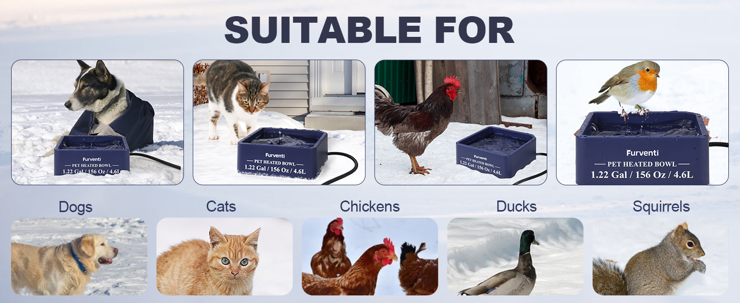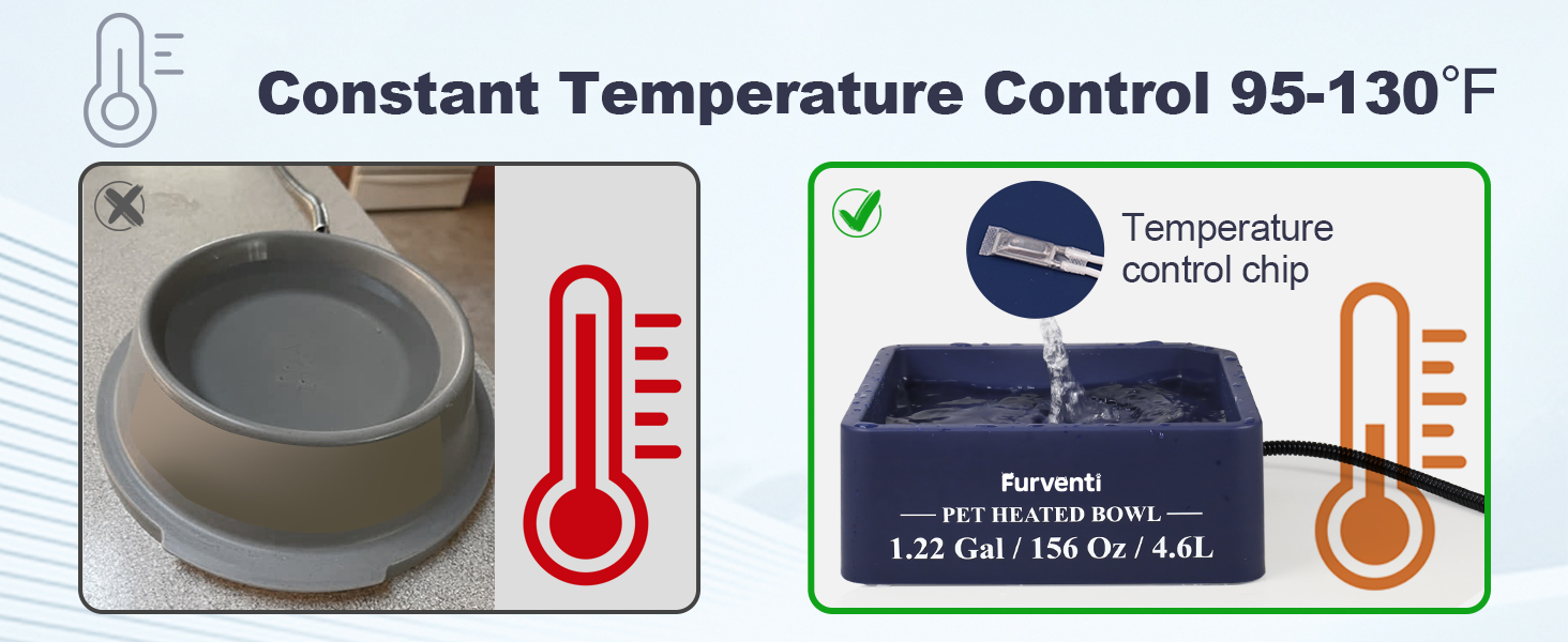 - 𝐔𝐬𝐞 𝐢𝐧 𝐄𝐱𝐭𝐫𝐞𝐦𝐞𝐥𝐲 𝐂𝐨𝐥𝐝 𝐖𝐞𝐚𝐭𝐡𝐞𝐫- This 45-watt heated water bowl controls the temperature at 95 ℉-130 ℉.It prevents water from freezing, ensuring your pets have access to water even in sub-zero temperatures, regardless of the weather conditions.