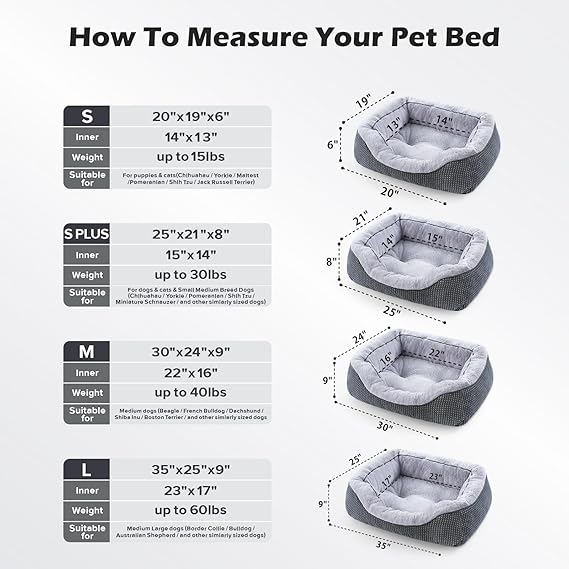 - SIZE DETAILS: Small dog bed for Small dogs or cats up to 15lbs, the outer size is 20"x19"x6"; Small Medium dog bed for pets up to 30lbs, the outer size is 25"x21"x8"; Medium dog bed for Medium dogs up to 40lbs, the outer size is 30"x24"x9"; Large dog bed for large dogs up to 60lbs, the outer size is 35"x25"x9"; Please be sure to confirm the size.