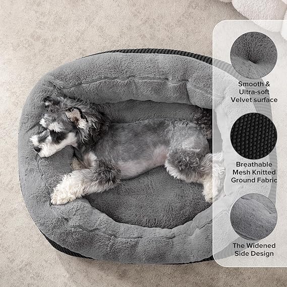 - ULTRA SOFT DOG BED: The sleeping surface of the pet bed features luxurious soft plush, soft and cozy plush provides a calming and anti-anxiety feel, allowing pets to fall into a deep sleep faster and gentle on the pet's nose and paw. The bottom and sides stuffed with thickened and eco-friendly pp cotton with strong supports to bony and joint areas, pressure relief, relieve joint pain.