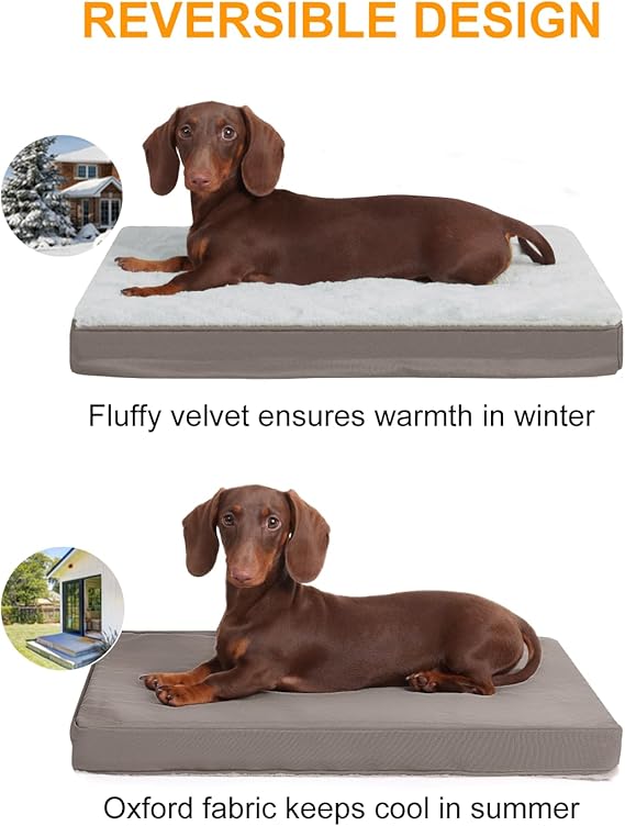 - Two-sided Design - One side of the dog bed features ultra-soft deluxe plush velvet, provides a warm shelter for our pet to snug in the cold weather. While the other side is made of Oxford fabric, it helps keep our dog cool in summer. The Oxford fabric is also durable enough to hold up to daily wear and tear.