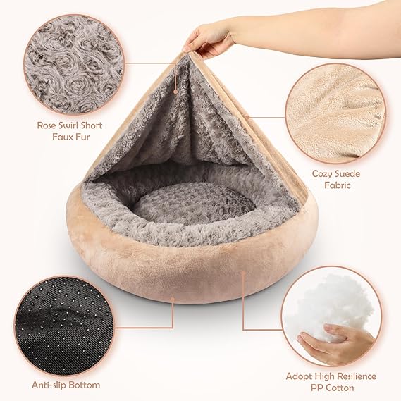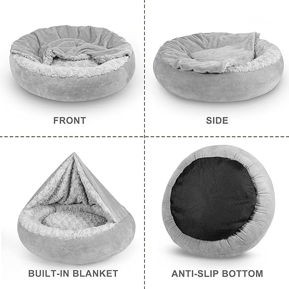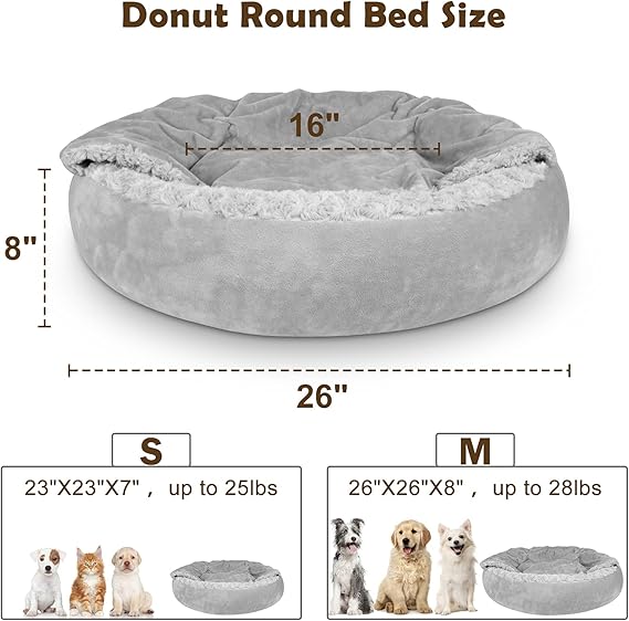 - Luxury Cat Cave Bed and Sofa: Our cat bed with a hood gives your furry friends some privacy and warmth! Donut Round dog bed provides the ultimate comfort for dogs/cats who love to cuddle, curl and snuggle while sleeping. Cat pillow is surrounded by cushioned walls, they have extra head and neck support and can settle deep in the snug crevices.