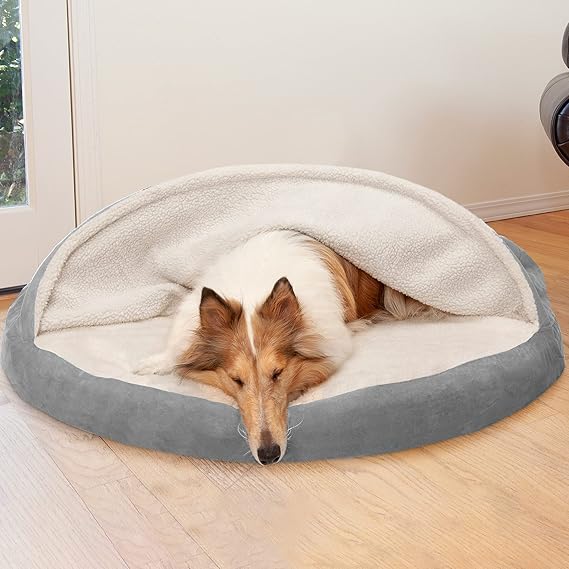 Furhaven Sherpa & Suede Snuggery Dog Beds are perfect for pets who love to burrow into blankets and other cozy spots! Snuggeries are constructed to let your dog or cat burrow and snuggle into the bed, with the top part of the bed functioning as a soft, shapeable, blanket. The soft hood feature can be used with or without the flexible plastic hoop to best suit your pet’s sleep style and burrow habits. The plastic hoop helps your pet get under the soft hood but does not stay up so that your pet will stay covered and cozy! The bed is fully lined in cream-colored sherpa fabric and provides a pleasant retreat for your pet’s privacy, warmth, and comfort! The mattress is made from egg-crate orthopedic foam, which promote your dog or cat’s ideal posture and joint health. Your pet will love their new cozy pet bed while you'll love having more room in your bed and less pet dander and fur! Easy to clean. Cover care: Remove from core before washing (see hang tag and/or seam label for care instructions). Foam care: Spot clean with mild soap; rinse. Blot, then air dry. Do not wring. Not for unsupervised use by animals with chewing behavior.