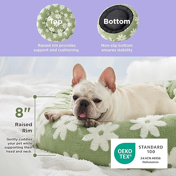 - Fashionable Flair: Available in stylish Cloud, Flower, Checkboard, and Heart patterns, this pet bed seamlessly blends comfort and style, allowing you to create a charming and cohesive living space with matching waterproof pet (and human-size) blankets.