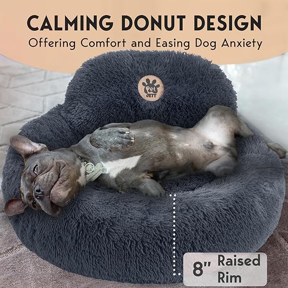PetJett Calming Small Dog Bed - 23'' Round Dog Beds, Anti-Slip & Washable Puppy Bed - Super Soft Fluffy Plush Faux Fur Pet Bed, Anti-Anxiety Premium Comfort Donut Bed, Fits Dogs upto 25 lbs, Dark Gray