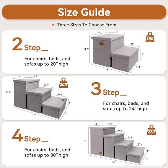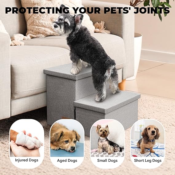 - MORE STABLE AND COZY: Zerbuger dog stairs are made of MDF and include foam, which relieves pressure on pets' paws and joints. Our pet steps are perfect as a warm GIFT for you hurt, disabled and elderly dogs. The removable board pads are placed inside to ensure that the pet steps are stable enough without any wobbling. The non-slip bottom ensures that the pet steps don't move. The dog stairs can support up to 200 LBS.