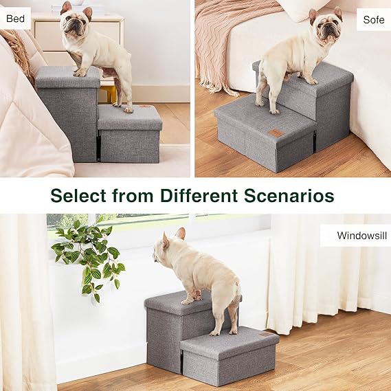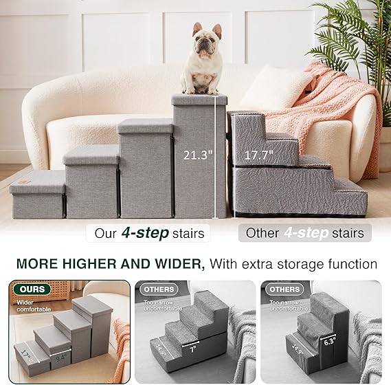 - 4-IN-1 DOG STAIRS AND STORAGE: Love's Cabin dog stairs serve not only as a ramp but also provide four storage compartments for pet items. With four large-capacity storage spaces beneath the steps, you can conveniently store pet accessories such as clothes, leashes, blankets, and nursing tools.