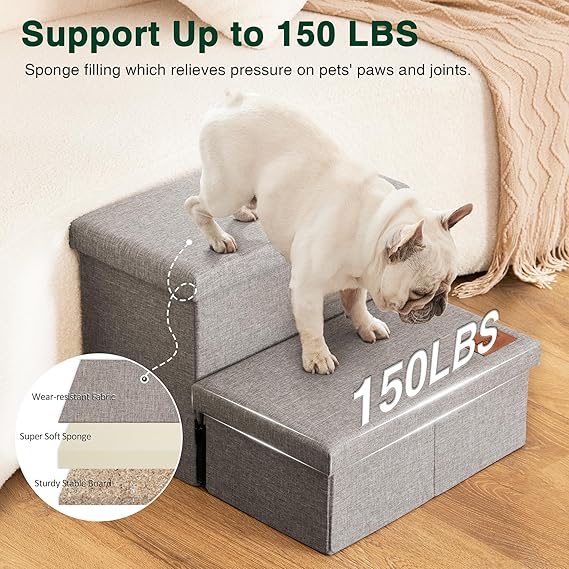 - MORE STEADY & COZY: Love's cabin dog stairs are made of wear-resistant fabric, include sponge and MDF, which is better relieve stress on your pets' paws and joints, the non-slip bottom ensure the pet steps are stable enough without any wobbling. The dog stairs can support up to 200 lbs.