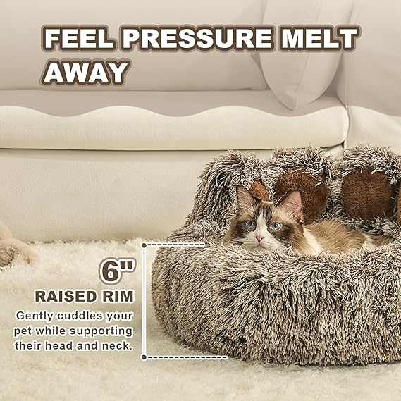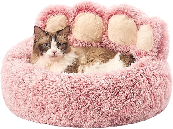 Jiupety Paw Shape Calming Pet Bed, Plush Faux Fur Donut Bed for Dogs & Cats, Machine Washable, Non-Slip Bottom, Large Size (26"×26"×8"), Pink