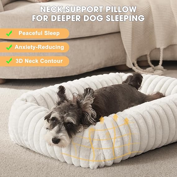 - NECK SUPPORT PILLOW FOR DEEPER DOG SLEEPING: The raised sides of dog beds for small dogs provide a cozy nook for your pet’s head and neck, promoting peaceful sleep. The 360°support-style security design helps new puppies adjust to new homes and reduces dog anxiety. The small dog bed's 2:1 mix of chopped foam and polyester fiber offers perfect support and comfort for pets of all sizes.
