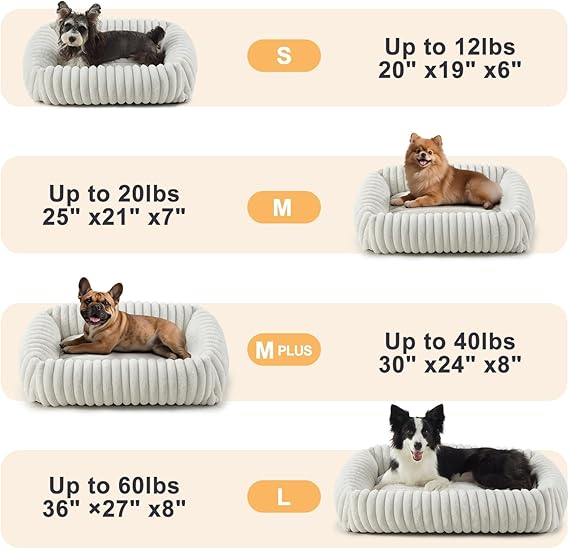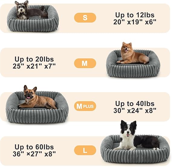 - SIZES FOR ALL PETS: Small dog bed for dogs up to 12lbs; outer size: 20"x19"x6"; Medium-size dog bed for dogs up to 20lbs; outer size: 25"x21"x7"; Medium-plus dog bed for dogs up to 40lbs; outer size: 30"x24"x8"; Large dog bed for dogs up to 60lbs; outer size: 36"x27"x8".