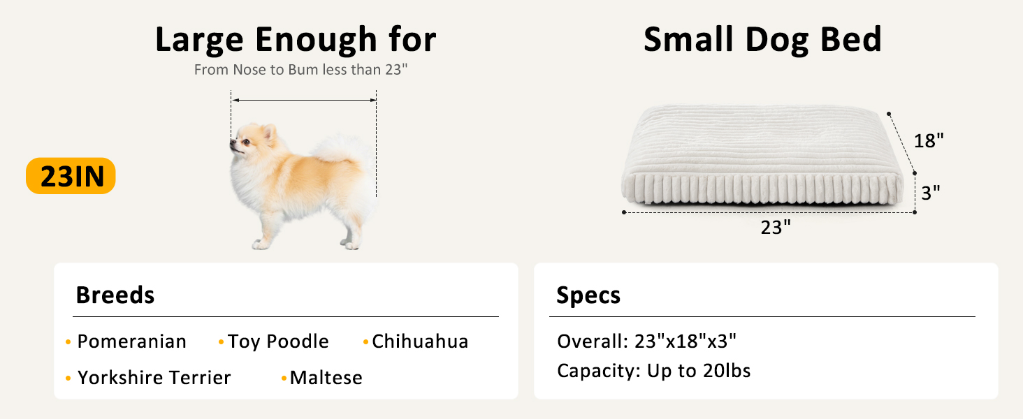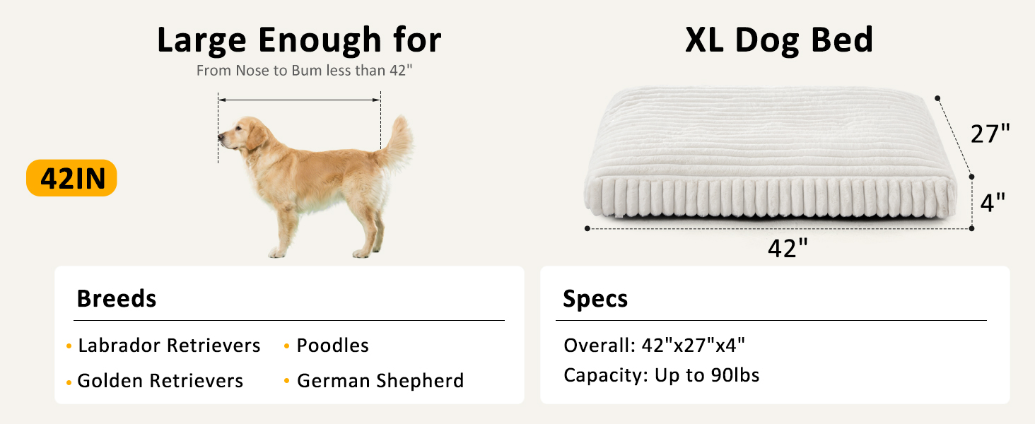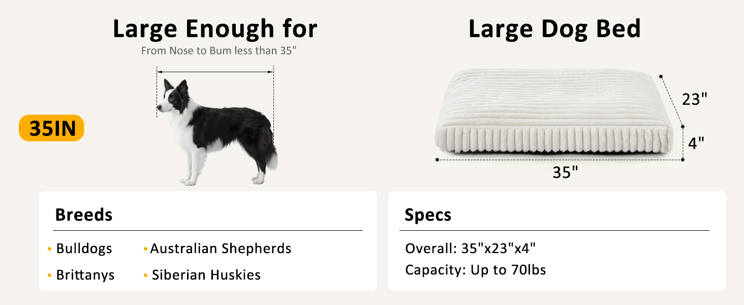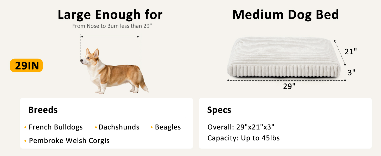 - SIZES FOR ALL PETS: Dog beds for small dogs for up to 20lbs; outer size: 23"x18"x3". Dog Bed Medium Size Dog for up to 45lbs; outer size: 29"x21"x3".Large dog bed for up to 70lbs; outer size: 35"x23"x4". XL dog bed for up to 90lbs; outer size: 42"x27"x4". XXL dog bed for up to 110lbs; outer size: 47"x29"x4". Anti-slip bottom of dog beds for a puppy, small, medium or large dog ensures your pet bed stays in place.