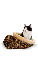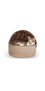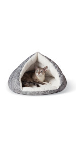 The K&H Pet Products Self-Warming Hooded Kitty Bed features a removable hood that offers pets privacy and a secure place to cuddle up. The soft polyfil cushion has a layer of metalized insulation that radiates warmth generated from the pets own body heat. The zipper around the bottom of the cat bed makes the cover removable and machine washable. High sidewalls make your pet feel secure and safe. Available in two sizes and two colors, perfect for keeping any cat or small dog warm on those chilly nights. A heated cat bed with no electricity required. Designed by K&H with OVER 20 years of experience in creating safe, innovative, quality products for pets. One-year limited warranty.