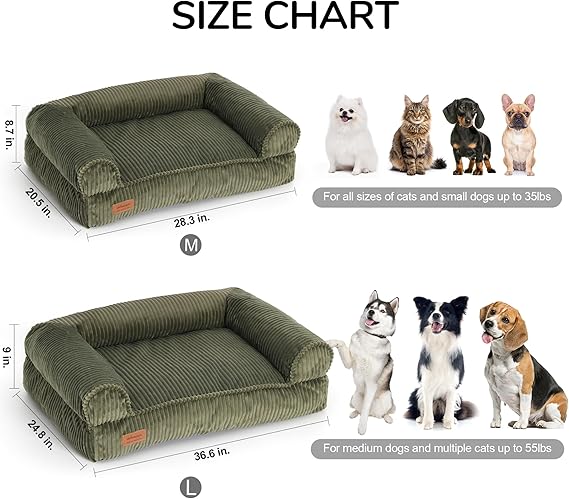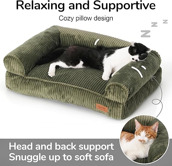 FUKUMARU Dog Couch Bed, Corduroy Cozy Cat Bed for Indoor Cats with Washable Cover, Supportive Waterproof Dog Beds Sofa for Small Dogs and Large Cats Cute, 28inch, Medium, Green