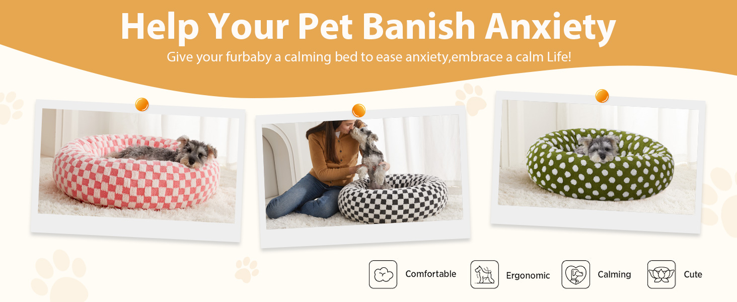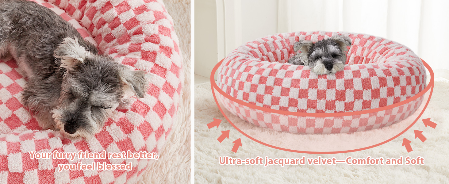 - 【SOFT COZY HEAVEN】This calming dog bed is made of delicate jacquard short plush fabric, cozy and fluffy, with a soft texture, just like touching clouds. Puppies can sink into the warmth of the cuddle dog bed and feel like they are wrapped in a cozy cloud.