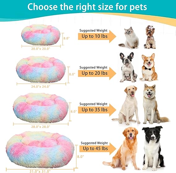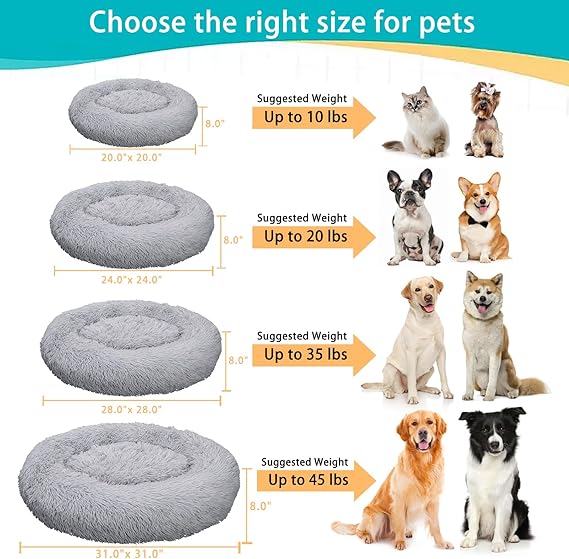 - [MULTIPLE SIZES AVAILABLE]:We have multiple sizes of dog bed for small dogs,available for dogs of different sizes.The 20inch small dog bed(weighing up to 9 pounds), the 24inch dog calming bed(up to 20 pounds),28inch medium dog bed(up to 35 pounds), 31inch donut dog bed(up to 45 pounds).Please select the appropriate size.