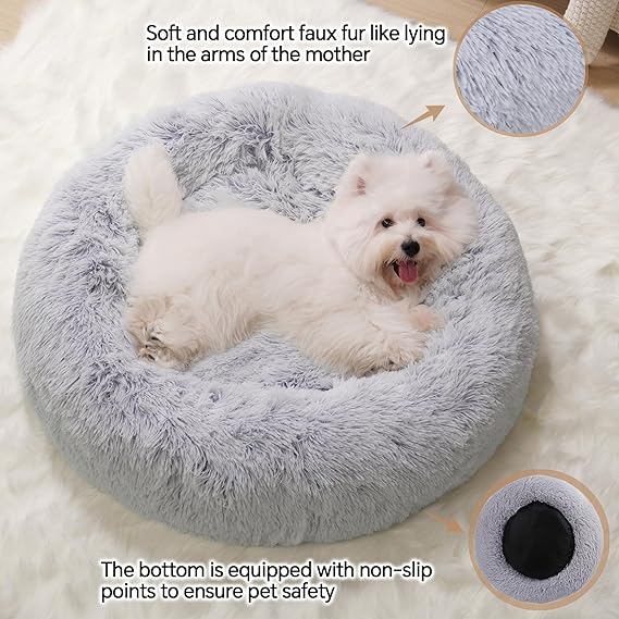 - [CALMING BED FOR DOGS]:The calming dog bed is covered with fluffy faux fur, providing pets with a sensation of lying in the cozy embrace of their pet mother. The anti-anxiety dog bed relieves pets' separation anxiety and stress. The anti-slip dot design at the bottom of the dog calming bed, ensures the safety of pets' sleep.