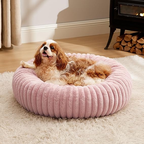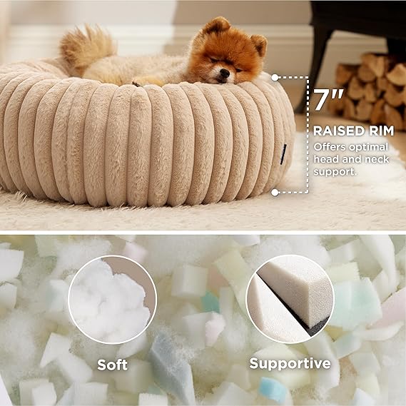 Bedsure Donut Medium Dog Bed - Washable Faux Fur with Corduroy Fleece & Anti Slip Bottom, Round Pet Bed with Removable Cover, Cream, 30x30x8 inches