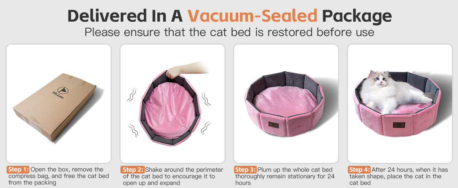 - Vacuum-packedds: This cat beds for indoor cats is vacuum-packed. When you receive it, please unpack it according to the instructions. It may appear deformed when you open it, but please tap the cat bed to expand it and fully restore it to its original shape. Kitten beds for indoor kittens should rest for 24 hours before being used for the first time, and they will return to their original condition