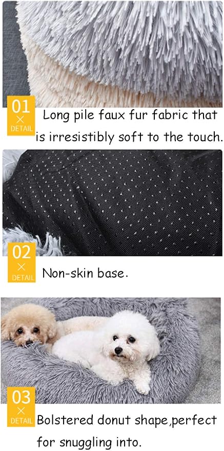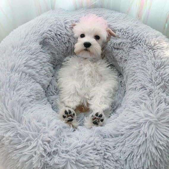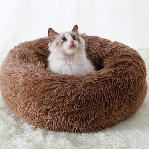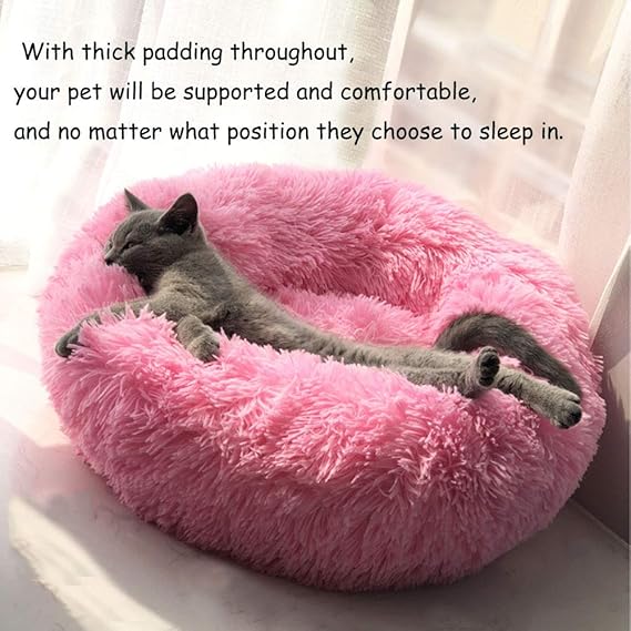 - Material:Make of attractive luxurious faux fur,macarons color donut shape.Round pet bed offers a safe, Ideal for a cat or small dog to snooze.Your little furry friends will feel surrounded by love and warmth, allowing them to experience truly restful sleep. restful sleep for improved behavior and better health.