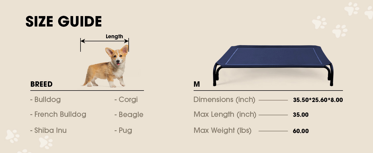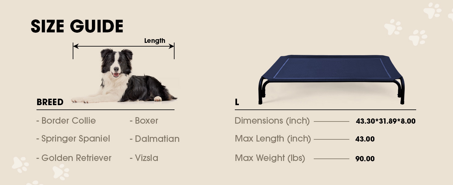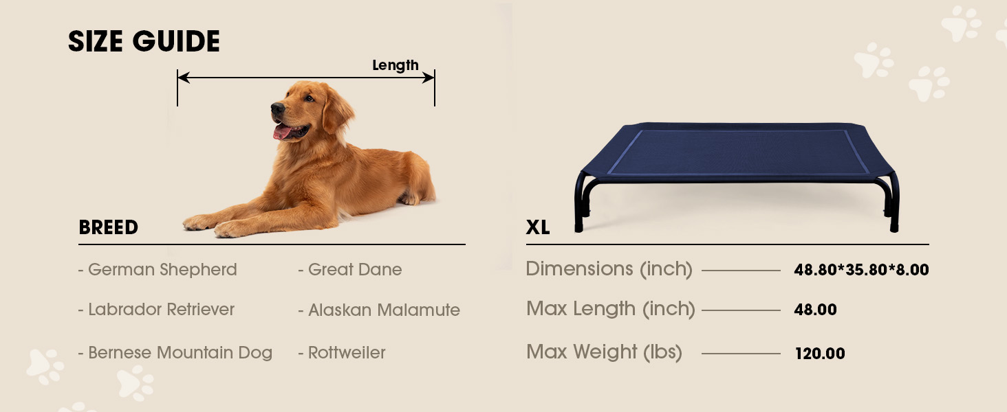 - 【Size Guide】This extra large outdoor dog bed ( 48.80"*35.80"*8") is suitable for large / extra large dogs up to 120 lbs, The classic pet cot design gives your fluffy friend plenty of room to sprawl out in any position, If you want your pet to have more room to lie down on the elevated dog bed, A larger dog bed is recommended.