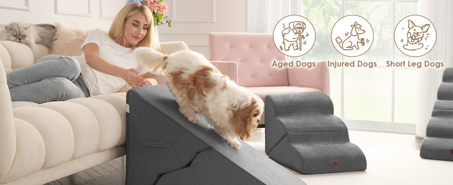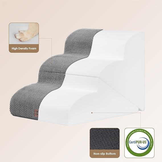 - SPECIFIC AND STEADY DESIGN - 33D density of pure foam make this stair more steady when your pets walk on. The dog bed stairs can provide strong support for pets in the walking process. Low angle slope design can better protect your pet's joints.