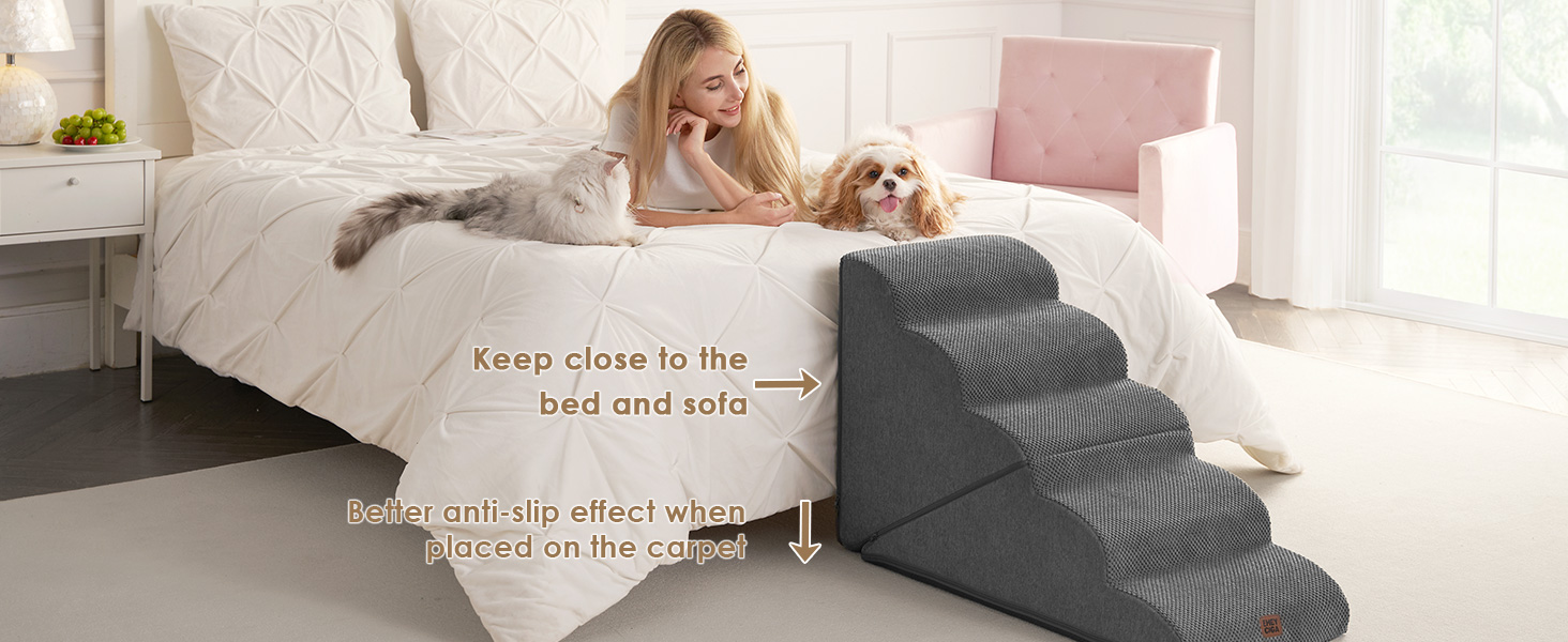 - COMFORTABLE PET STAIRS - This foam dog stair is designed directly against the edge of a bed, sofa or other furniture, so your pet can climb up and down comfortably.