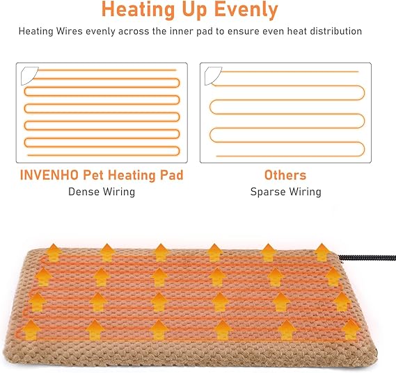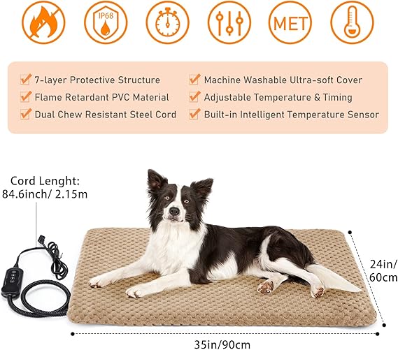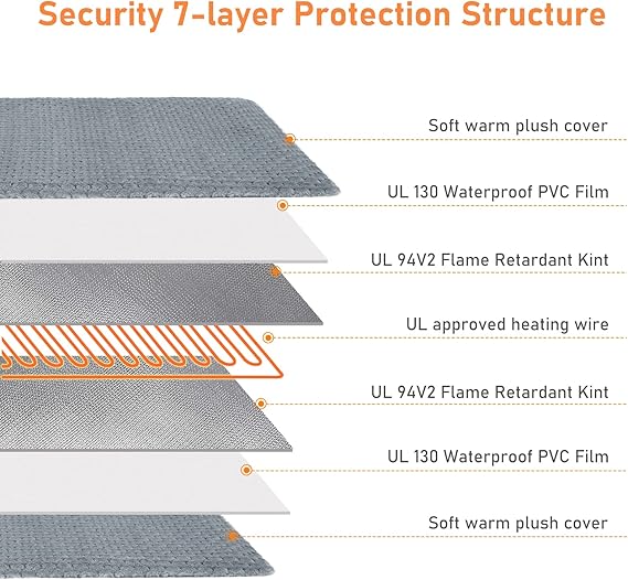 - Unique Safety Design: In order to prevent dogs from biting the wire and getting electrocuted, the wire is wrapped by spiral chewy cover. 7-layer protective structure with UL-certified heating wire protect pets from burns. Soft PVC envelope with waterproof and flame-retardant function. Built-in intelligent temperature sensor in the heating pad to prevent overheating to protect pets. Don’t let your pets lay on the pet heating pad without a plush cover.