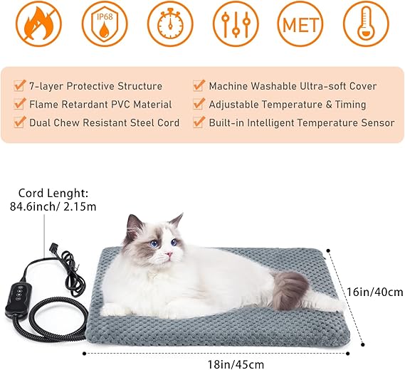 INVENHO Heated Cat Bed, Waterproof Adjustable Temperature Dog Cat Heating Pad with Timer, Indoor Pet Heating Pad for Cats Dogs Electric Pads for Dogs Cats, Pet Heated Pad (S: 18" x 16")
