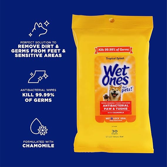Wet Ones for Pets Paw & Tushie Wipes for Dogs are designed with your pet in mind for a quick, gentle, & healthy clean anytime, anywhere! Wet Ones for Pets Multipurpose Wipes for Dogs are great for using after walks or for a quick clean for their more sensitive areas. These OK, easy to use dog wipes are formulated with chamomile to reduce skin irritation and soothe delicate areas like paws and dog butts. This variety of dog wipes comes in a fresh Tropical Splash scent, leaving behind just a hint of a great smell that everyone can enjoy. The 30 count pouch comes with a Wet Lock seal to maintain freshness. Made specifically for pets and OK for use after outdoor playtime or indoors, these Wet Ones wipes for dog butts and wipes for dog paws keep and your home clean and smelling fresh. Directions: 1. Remove wipe from pouch and reseal to maintain freshness. 2. Wipe dog's feet or bottom as needed. 3. Dispose of wipe in trash, do not flush. 4. Play on! Ingredients: Water, PEG-7 Glyceryl Cocoate, Aloe Barbadensis Leaf Juice, Sodium Benzoate, Benzalkonium Chloride, Retinyl Palmitate (Vitamin A), Tocopheryl Acetate (Vitamin E), Chamomilla Recutita (Matricaria) Flower Extract, Polysorbate 20, Fragrance WARNINGS: For external use only. OK for dogs 8 weeks of age and older. Avoid contact with eyes. Keep out of reach of children. YOUR SATISFACTION IS OUR PRIORITY: If you have any questions or feedback, please reach out to us at info@fetch4pets. WET ONES is a trademark of Edgewell Personal Care Brands, LLC and is used under license. 2020 Edgewell. WET ONES and WET LOCK are trademarks of Edgewell Personal Care Brands, LLC and are used under license. 2020 Edgewell.