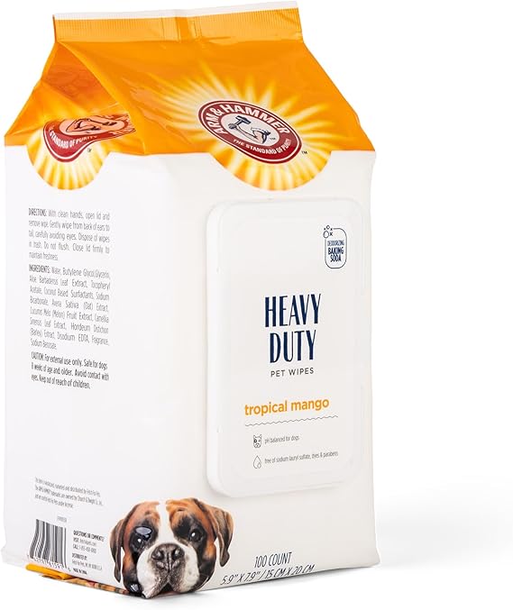 Unleash the power of baking soda with Arm & Hammer grooming products. Arm & Hammer uses the power of baking soda to refresh a stinky coat and eliminate odor. The baking soda dissolves into fine particles, getting into hard to reach areas, resulting in a deeper clean. These heavy duty Wipes will make keeping your dog clean a pleasant experience for you and your pet and is safe to use with topical flea and tick treatments. Arm & Hammer heavy duty bath wipes are a durable solution for quick tidy-ups between bath time. Clean paws after a walk or use as a refreshing and speedy wipe down. These wipes remove any excess debris and are enhanced with baking soda particles that dissolve and eliminate odors. A long lasting and sweet Mango scent are left behind for all day freshness. These gentle wipes are free of harsh chemicals. DIRECTIONS: Thoroughly wet the dog's coat with warm water. Apply shampoo and work into a lather from the back of the ears to tail, being careful to avoid contact with eyes. Rinse well. INGREDIENTS: Water, butylene glycol, glycerin, Aloe Barbadensis leaf extract, tocopherol acetate, coconut based surfactants, sodium bicarbonate, Avena Sativa (Oat extract), Cucumis melo (melon) fruit Extract, Camellia sinensis leaf extract, Hordeum distichon (Barley) extract, Disodium EDTA, fragrance, DMDM hydantoin. WARNINGS: For external use only. Safe for dogs 8 weeks of age and older. Avoid contact with eyes. Keep out of reach of children. YOUR SATISFACTION IS OUR PRIORITY*: If you have any questions or feedback, please email us via email.