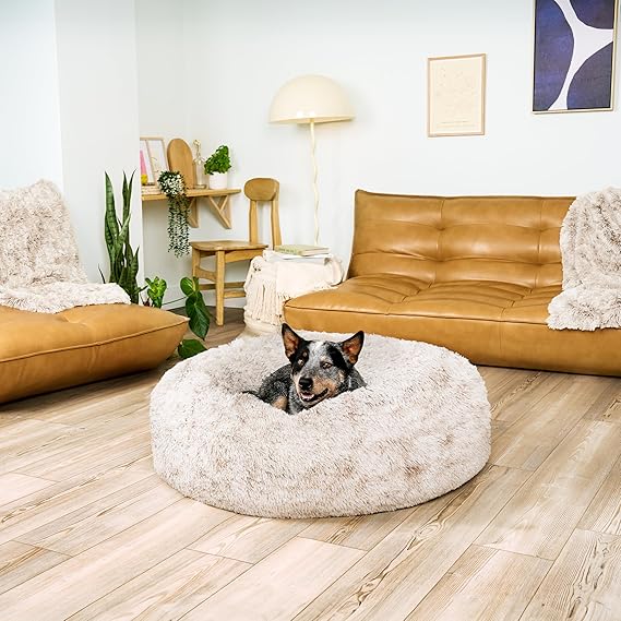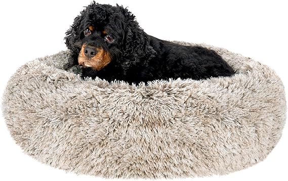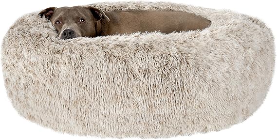 Furhaven Plush Long Faux Fur Calming Donut Dog Beds are designed to embrace pets in warmth and comfort - creating a calm space that soothes anxiety and promotes a deeper and more restorative sleep for your dog or cat. Deep bolstered edges create cozy "pockets" of extra warmth for a self-warming effect your pet will love. These hidden spaces are also perfect for burrowing or hiding favorite toys and treats from other "pack members"! Luxuriously long vegan fur is soft on snouts and paws and is so plush you will be tempted to steal this donut bed for yourself. The 23" donut bed is fully washable, while the other sizes come with a removable and washable zippered cover. Make sure to dry completely before use to avoid matting.