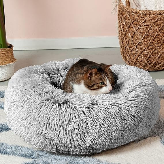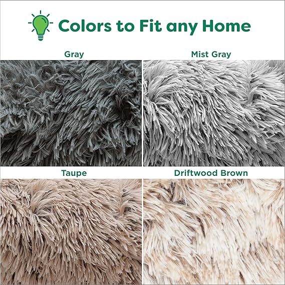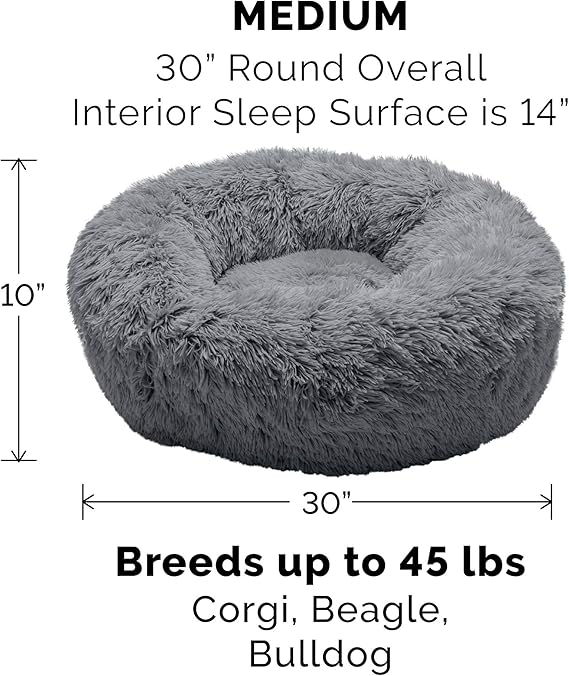 Furhaven 30" Round Calming Donut Dog Bed for Medium/Small Dogs, Refillable w/ Removable Washable Cover, Up to 45 lbs - Shaggy Plush Long Faux Fur Donut Bed -Mist Gray, Medium,30.0"L x 30.0"W x 10.0"Th