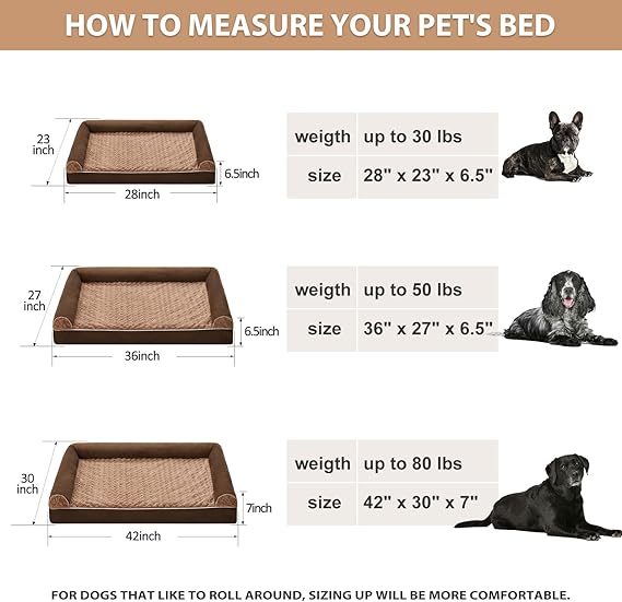 - DIMENSIONS (DOG BEDS FOR MEDIUM DOGS): jumber plus dog bed 54" x 36" x 7" (3.5" bolstered side ) for medium and large dogs up to 150 lbs. For dogs that like to roll around, sizing up will be more comfortable.