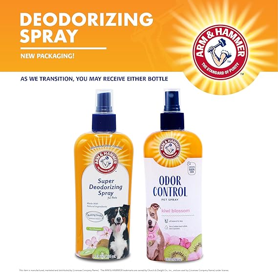 Bathe your dog with the name you trust. Arm & Hammer uses the power of baking soda to refresh a stinky coat and eliminate odor. The baking soda dissolves into fine particles, getting into hard to reach areas, resulting in a deeper clean. This shampoo will make bath time a pleasant experience for you and your pet and is safe to use with topical flea and tick treatments. Our odor eliminator spray for dogs is a combination of odor eliminators and a fresh kiwi blossom scent to work hard on one job: getting rid of even the smelliest odors. Our formula is gentle enough for all dogs and puppies to use, and leaves behind a sweet smell that they'll love! It is effective whether you need to eliminate wet dog odor (use liberally and comb through gently) or if you need to deodorize dry dog scent (for short-haired dogs, spray the Arm & Hammer deodorizing spray into your hand then lightly massage into the coat). This product works on virtually any dog--even dogs with sensitive skin--and it is made with all natural ingredients. This comes with 6, 8 oz bottles of our super deodorizing spray for pets. DIRECTIONS: Spray dog from back of ears to tail, carefully avoiding eyes. Massage into coat. Repeat as necessary. Can be used on wet or dry fur. For external use only. INGREDIENTS: Water, Coconut Based Surfactants, Sodium Bicarbonate, Actinidia Chinensis (Kiwi) Fruit Extract, Lavandula Angustifolia (Lavender) Flower Extract, Honey, Rosmarinus Officinal (Rosemary) Leaf Extract, Verbena Officinalis Flower Extract, Citrus Medica Limonum (Lemon) Peel Oil, Yogurt Extract, Glycerin, Disodium EDTA, Fragrance, DMDM Hydantoin. WARNINGS: For external use only. Safe for dogs 8 weeks of age and older. Avoid contact with eyes. Keep out of reach of children.