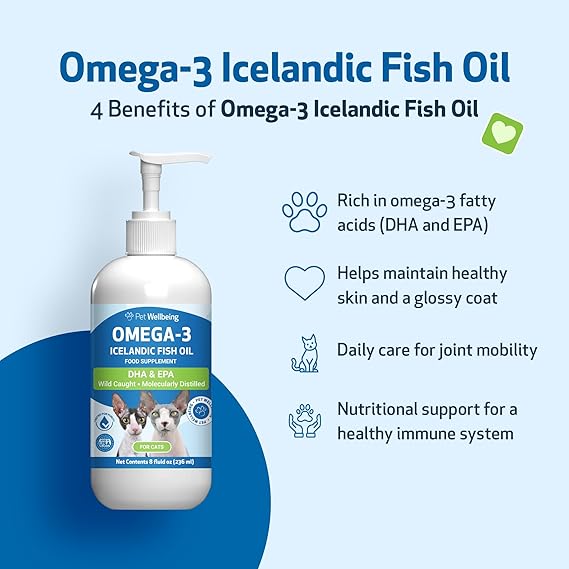 Pet Wellbeing Omega-3 Icelandic Fish Oil for Cats - Wild-Caught, Cold-Water Fish, Healthy Skin and Coat, Joint Health and Mobility, Fatty Acids, Anchovies, Sardines - EPA, DHA - 8 fl oz (236 ml)