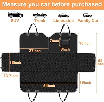 - Fit for Most Vehicle Size: Our dog car seat cover 54" W x 55” L (Maximum open size) can cover the entire back seat designed for most cars, trucks and SUVs,recommend that truck and Large SUV models choose X-large sized dog car seat cover
