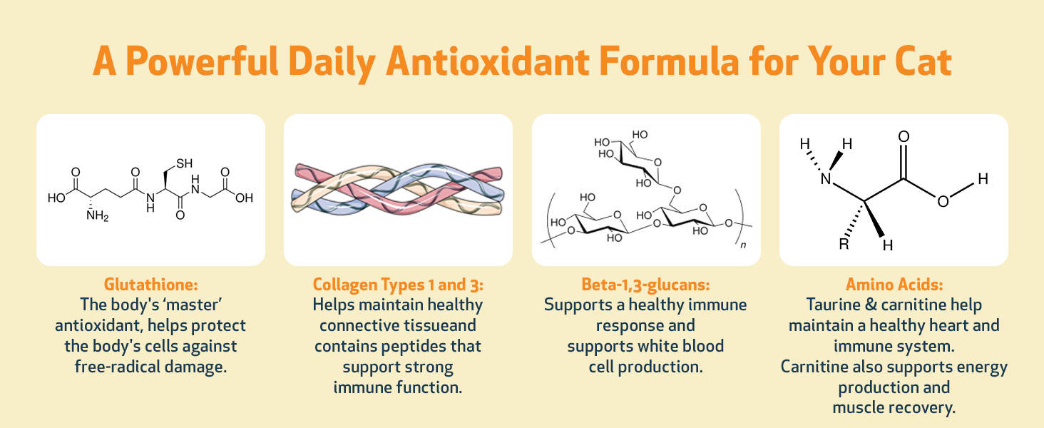 - IMMUNE SUPPORT. Offers your feline friend nutrients and vitamins that support a healthy immune system response, including vitamin E, beta-glucans, and collagen type 1 & 3.