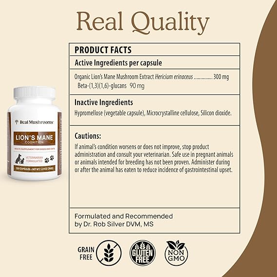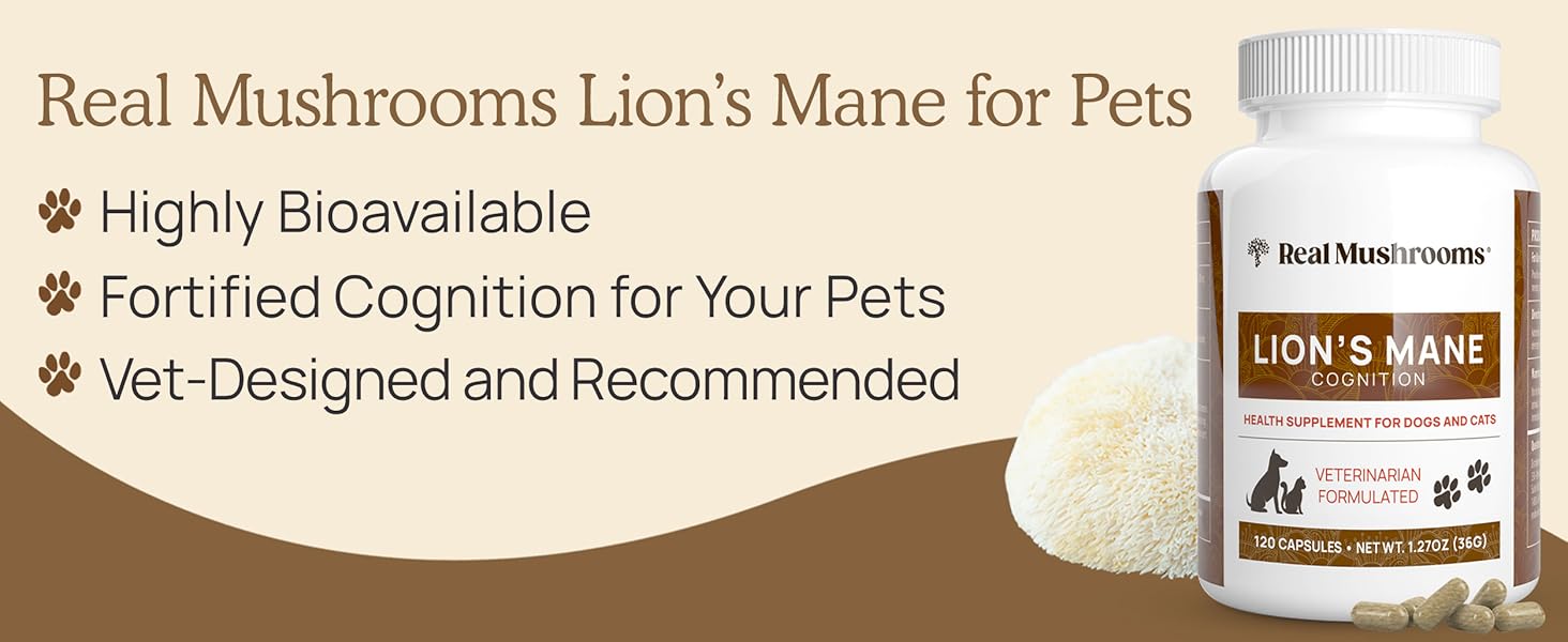 Real Mushrooms Lion’s Mane Pet Mushroom Supplement - Pet Wellbeing Capsules - for Cat & Dog Supplement & Vitamins - Support Mindful Routines - Organic, Vegan, Non-GMO, 120 Count