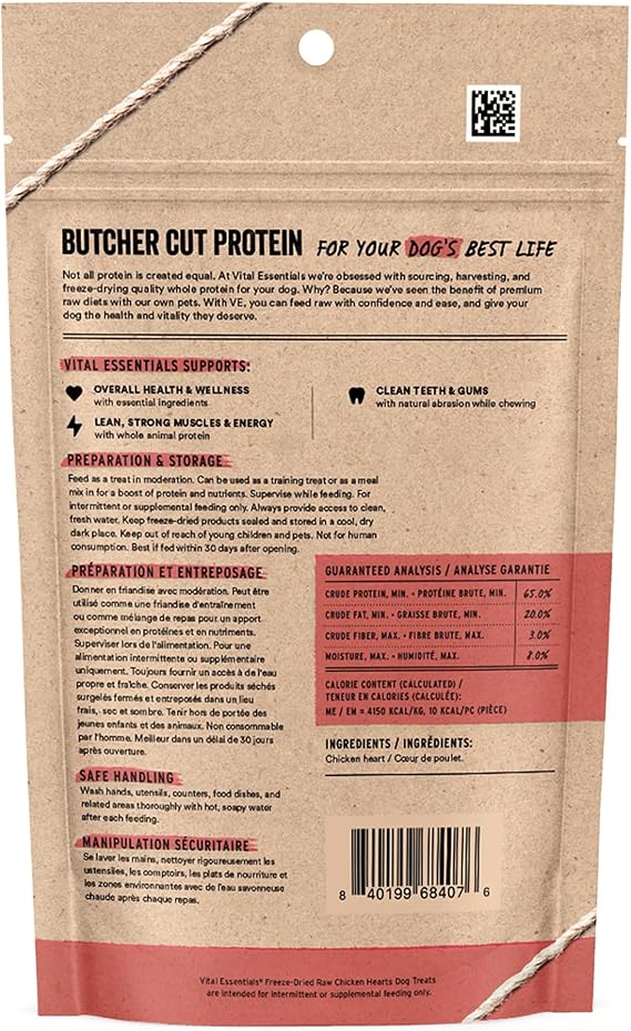 Vital Essentials Single Ingredient Chicken Hearts Dog Treats, 1.9 oz | Freeze-Dried Raw | Premium Quality High Protein Training Treats | Grain Free, Gluten Free, Filler Free