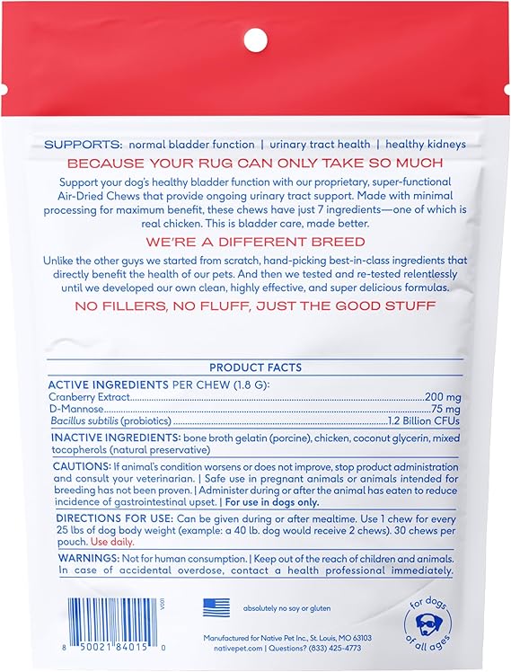 - CLEAN LABEL WITH LESS INACTIVE INGREDIENTS: Our cranberry supplements for dog bladder control use all-natural ingredients like D-Mannose, Cranberry Extract, Probiotics & real chicken, with no added fillers or artificial flavors—to support urinary health naturally.