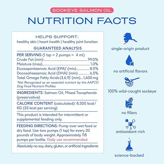 - BOOSTS HEART FUNCTION & OVERALL WELLNESS: Our salmon oil for cats and dogs is packed with EPA omega-3s to support heart health and boost overall vitality. A trusted dog salmon oil supplement for lifelong wellness in every drop.