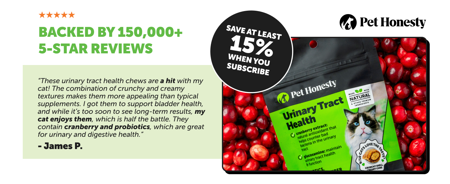 - FROM THE INSIDE OUT: Pet Honesty’s Cat Urinary Health are crunchy, creamy supplements that support urinary health with cranberry for bladder which is a natural antioxidant that helps counter bad bacteria in the urinary tract, glucosamine for cats to support urinary tract function, as well as prebiotics, probiotics & fiber to support gut health. This is supplement support that’ll help put an extra pounce in your pet’s step & help them feel their best.