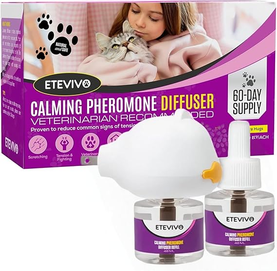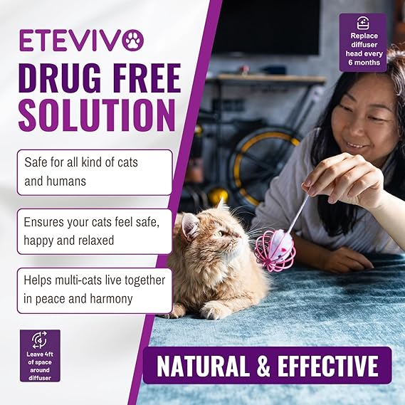 - ADVANCED CALMING FORMULA - The ETEVIVO cat pheromones calming diffuser leverages cutting edge pheromone technology to deliver superior relief from feline anxiety, this cat pheromone diffuser is designed to create a tranquil and harmonious environment, ensuring your cat feels safe and stress free