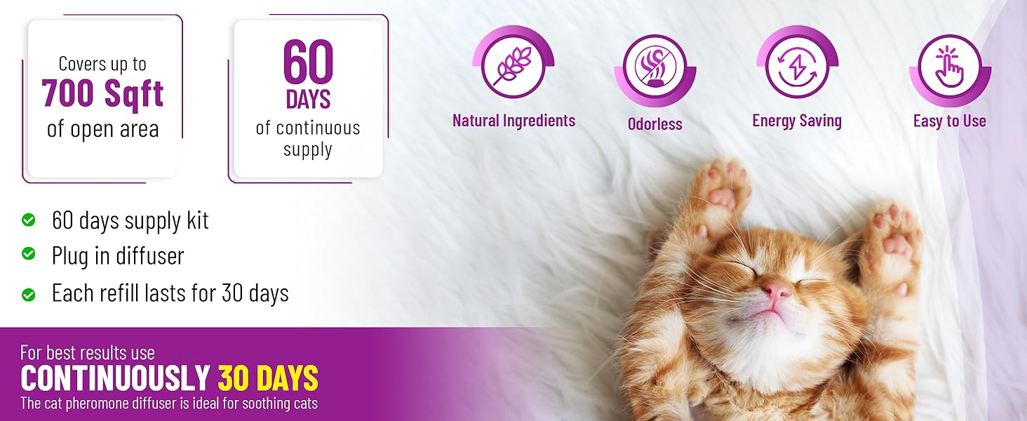- EXTENDED RELIEF PACKAGE - Each ETEVIVO multi cat pheromone diffuser comes with 2 refills, providing up to 60 days of continuous anxiety relieving comfort, enjoy peace of mind knowing your cat is surrounded by a soothing atmosphere, day and night