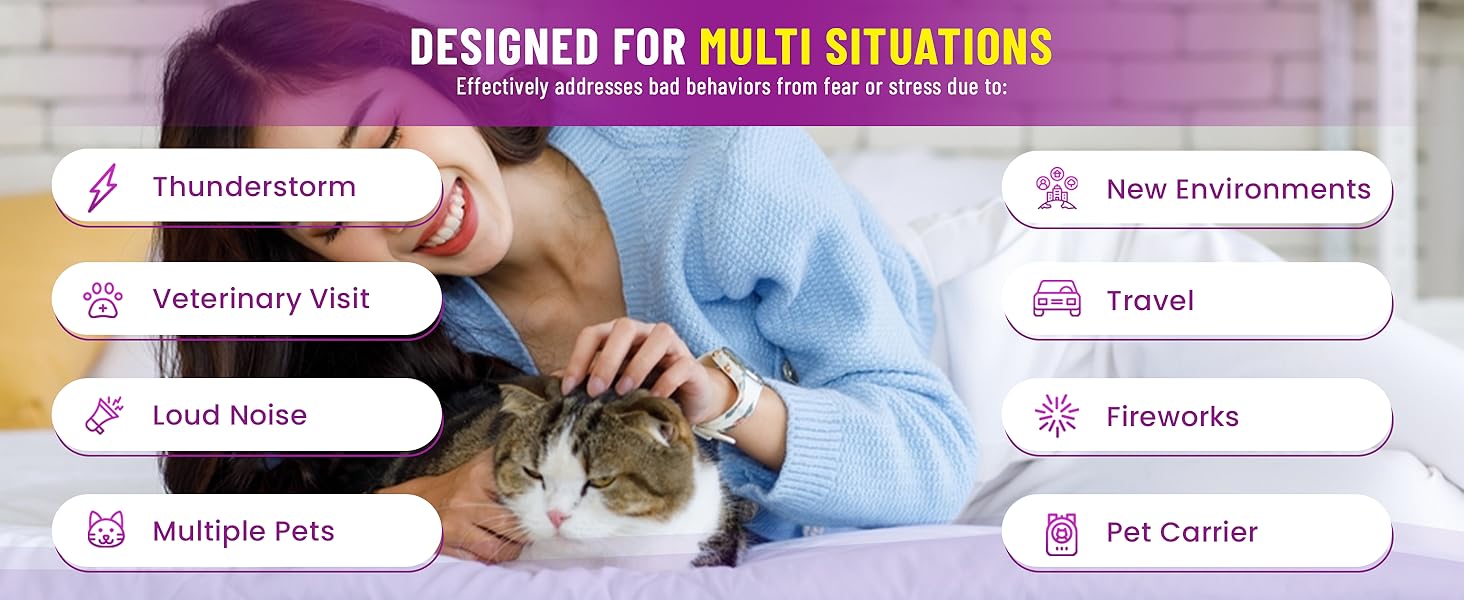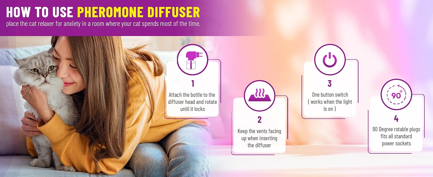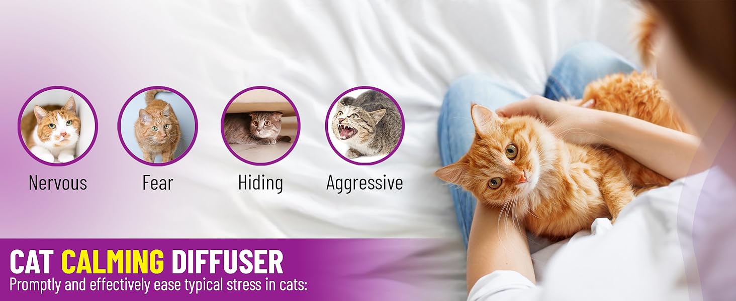 - COMPREHENSIVE STRESS REDUCTION - Eliminate stress related behaviors such as hiding, scratching, and spraying with our pheromone diffuser to calm cats, this cat calming pheromone diffuser transforms your home into a peaceful heaven, promoting positive behavior and strengthening the bond between you and your feline companion