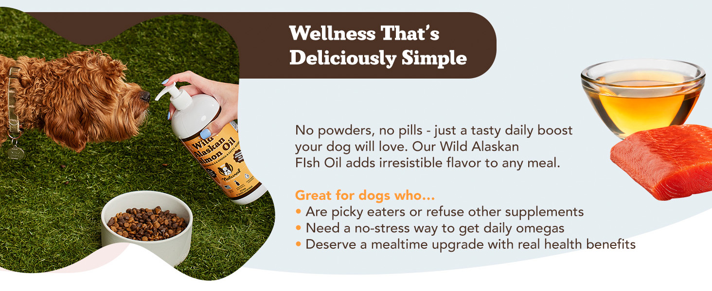 - DAILY FOOD TOPPER DOGS LOVE: Even picky eaters enjoy this tasty salmon oil food topper. Just pump on meals to boost flavor and nutrition no pills required. Our organic salmon oil for dogs is safe, palatable, and pairs perfectly with other holistic dog supplements to support skin, joints, and coat from the inside out.