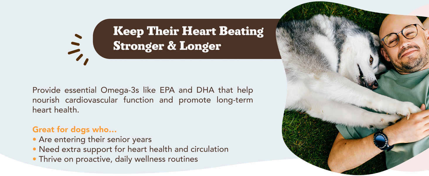 - JOINT, HEART, & IMMUNE WELLNESS: This powerful dog fish oil supplement supports joint mobility, heart function, and immune health in all breeds and life stages. Whether you have a senior or an active pup, our omega 3 for dogs helps keep them thriving with daily support from natural fish oil for dogs, a clean source of whole-body nourishment.