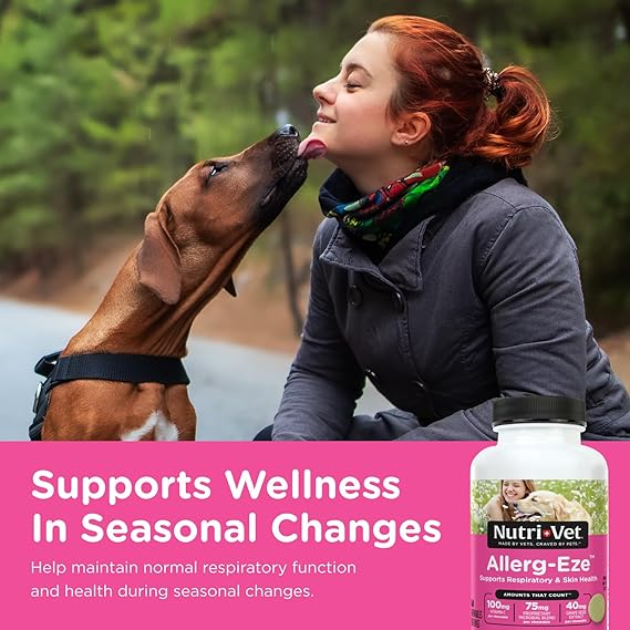 Nutri-Vet Allerg-Eze Chewables are veterinarian-formulated to provide powerful support for dogs struggling with seasonal allergies, itching, and immune challenges. This advanced allergy supplement for dogs combines antioxidants and omega-3 fatty acids to help maintain normal respiratory function, soothe skin, and promote overall well-being. Whether your dog experiences pet allergies during seasonal changes or needs year-round support, these allergy chews deliver effective relief in a tasty, easy-to-give chewable form. Each chewable tablet is designed to help reduce itching, sneezing, and other common symptoms associated with dog allergies. The blend of antioxidants works to defend cells against free radicals, while omega fatty acids nourish the skin and coat, helping dogs with allergies maintain healthy skin and a glossy coat. This unique formula provides seasonal allergy support for dogs while also boosting the immune system to address environmental sensitivities. Nutri-Vet’s allergy and immune supplement for dogs is an excellent choice for pet parents seeking an easy, daily solution to support their dog’s respiratory health, skin comfort, and overall vitality. From small dogs to large breeds, Allerg-Eze chews provide targeted benefits without harsh chemicals, offering safe, veterinarian-formulated support. Perfect for dogs with allergies, pet parents can feel confident knowing their furry friend is getting quality care backed by science. Support your pet’s comfort with Nutri-Vet Allerg-Eze Chewables — the trusted choice for allergy relief, immune health, and seasonal itch support.