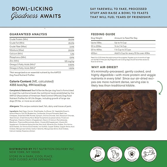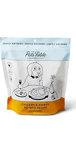 The Pets Table 2 Pack Variety of Air-Dried Food. Our Air-Dried Dog Food, expertly crafted in collaboration with a Board Certified veterinary nutritionist and brought to you by HelloFresh. Our nutritious food features high-quality chicken, paired with wholesome ingredients like sweet potatoes, carrots, oats, barley, and spinach. Each batch is gently air-dried to retain essential nutrients and enhance flavor, ensuring your pets savor every bite. Formulated to meet AAFCO nutritional standards for all life stages, our balanced dog food is ideal for pets of all sizes, including large breeds. With its grain-inclusive recipe, it provides beneficial grains like barley and oats for added fiber and energy. Your dog will enjoy a deliciously tender texture that is easy to chew and digest. Plus, preparation is a breeze—simply store in a cool, dark place and serve the recommended portion size. With The Pets Table Air-Dried Dog Food, you’re not just feeding your pup; you’re offering a complete meal packed with superfoods for optimal health. Treat your furry family member to the delicious nutrition they deserve with our premium air dried dog food. Experience the joy of knowing you’re providing the best for your pets!