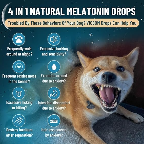 - Natural Stress Relief, Sleep Aid, and Hair Support: Is your dog experiencing occasional restlessness or nervous behavior? VICSOM 2pack Dog Melatonin Drops use natural ingredients to support your dog's well-being by supporting restful sleep, helping relaxation, and supporting healthy skin and hair. Whether for dog melatonin for small dogs or dog melatonin for large dogs, gentle solution is ideal for dogs of all sizes.